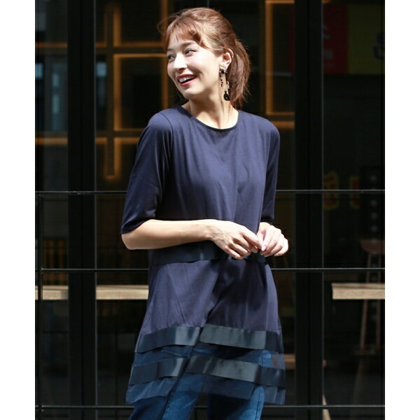 ー女性らしさUP!一気にお出かけ着にもグレードアップー グログランリボンシアーラインカットソーPOINT・ふんわり柔らかいシンプルカットソー・大人な女性らしさもありながらリボンとシアーメッシュで可愛さも+・ヒップラインが隠れる丈なので細身のパンツとも相性◎・ジャケットを羽織ってON/OFFにも使える・シワになりにくく、ご旅行にも最適です!生地:柔らかくとろみのある素材[型番:M913631]■カラー:ネイビー(500)、ブラック(000)[サイズ(cm)]M(38): 着丈83.5 バスト100 裾幅70 肩幅38 袖丈35 袖口幅13.5L(40): 着丈85.5 バスト104 裾幅72 肩幅40 袖丈36 袖口幅14※( )で表記されている数字はヌードサイズです。